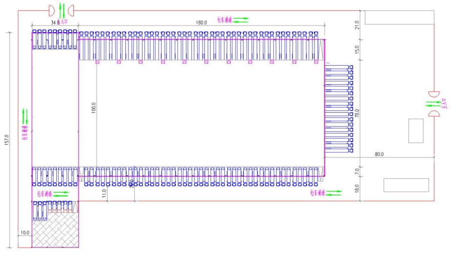 1、库房东面做高5米,宽4米的外挑雨棚,长度为78米。两侧位置各安装125A充电桩开关20个。共计40个。小库外墙拆除做行车通道,宽度为10米。